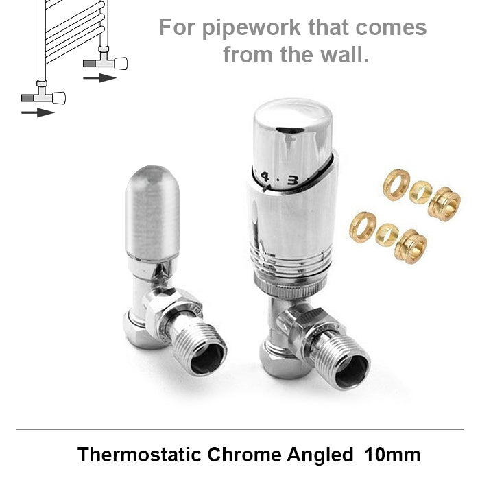 This item is the 15mm radiator Angled Thermostatic Radiator Valves that includes a small brass size reducer which then allows connection to 10mm pipework in your household.